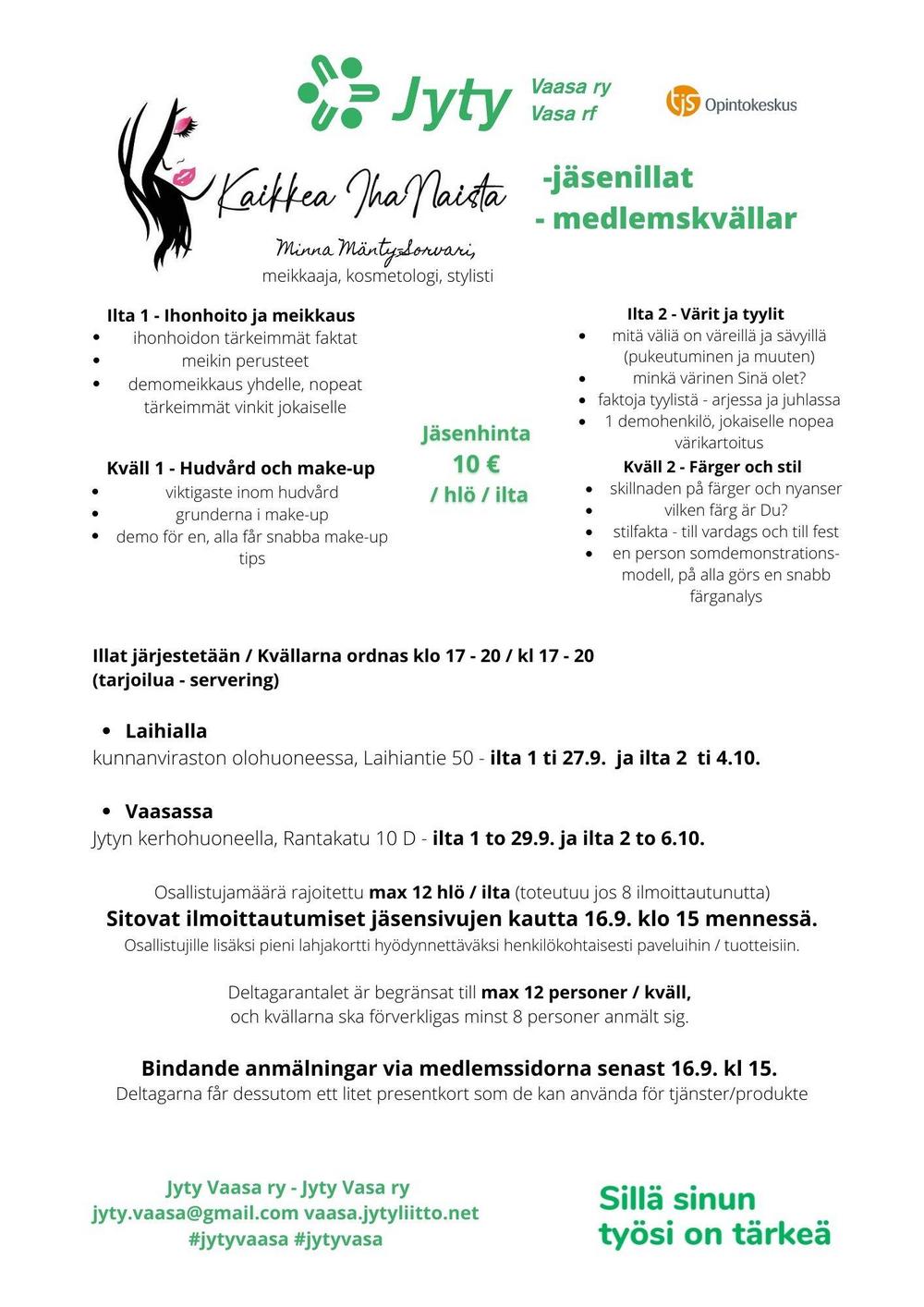 Vaasan molempiin iltoihin muutama paikka vapaana, kysy lisää spostilla jyty.vaasa@gmail.com